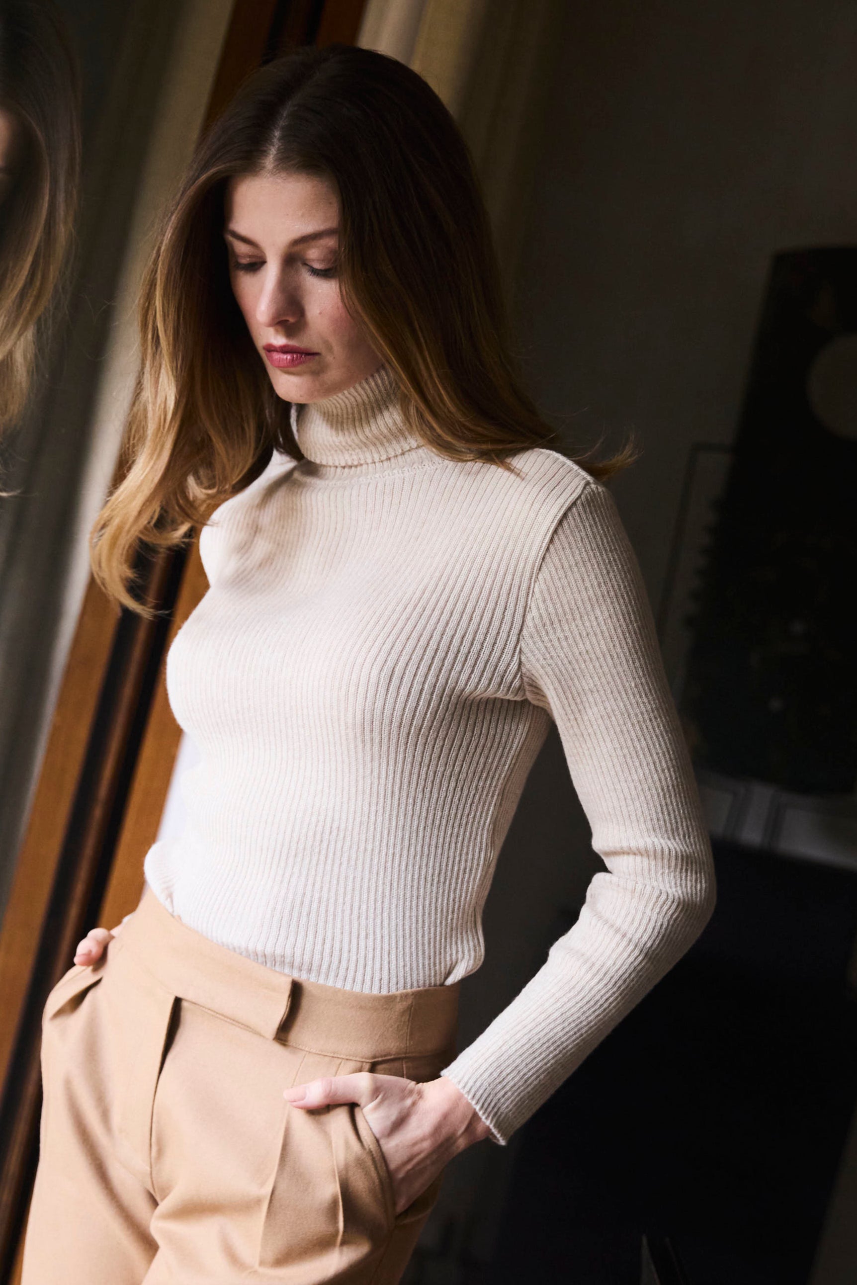 Confeccionado en baby alpaca que se obtiene de la primera esquila de las alpacas peruanas y un porcentaje de polyester.