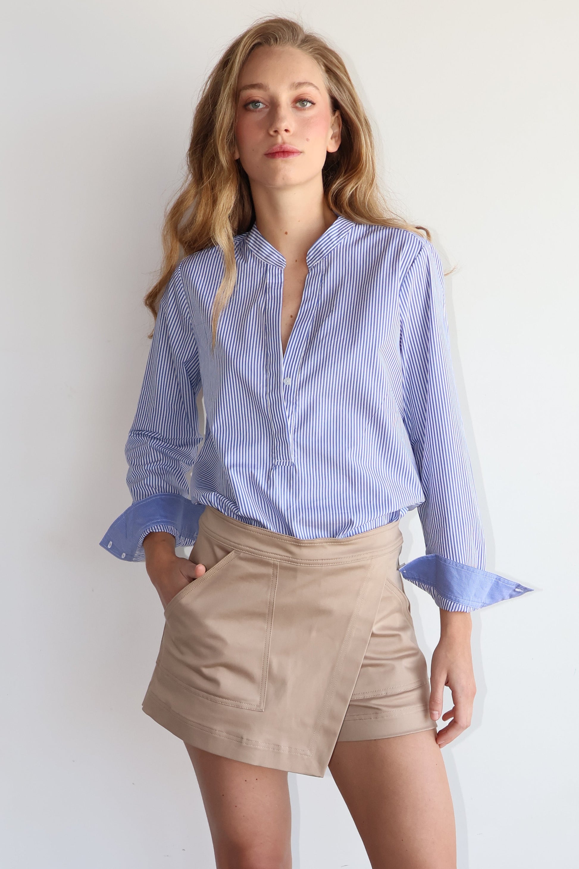 Mini/short de gabardina, 100% algodón, en color beige. Un short que parece mini, abotonado en la parte posterior con cierre al medio, que realza tu silueta y te hace ver espectacular. Ideal para usarlo con el chaleco beige, poleras o con lo que quieras.