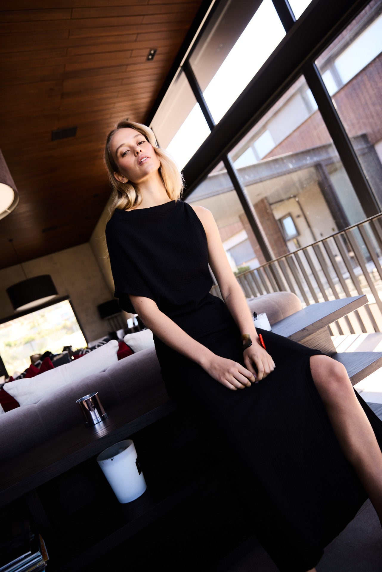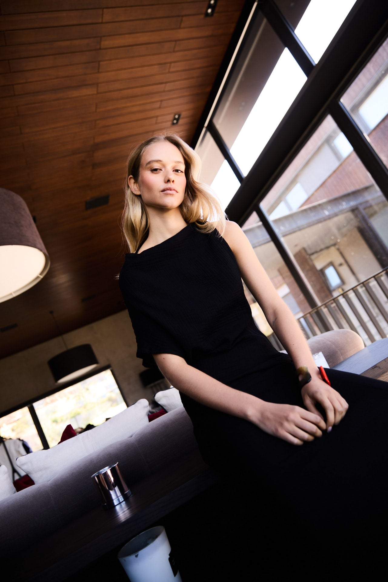 Este vestido en 100 % algodón premium peruana, es un vestido versátil asimétrico en la parte superior con una manga corta y otra halter. Puede usarse tanto de día como de noche. Todo depende con que lo uses.